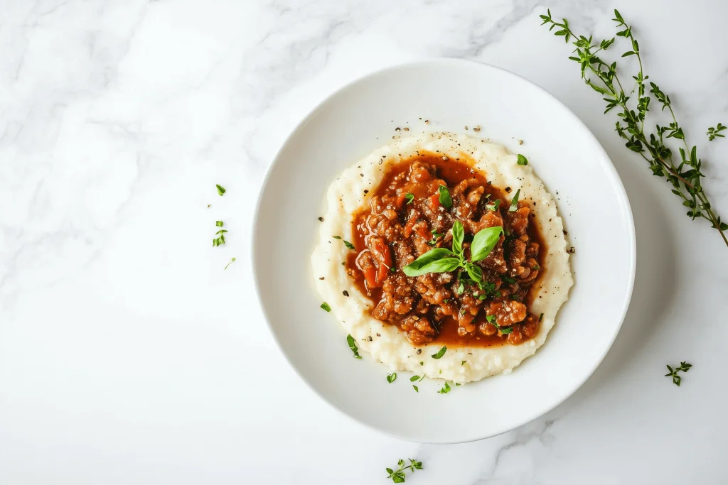 1. 2 EL Butter in einem Topf schmelzen und 1 geschälte und fein gehackte Zwiebel, 2 geschälte und geriebene mittelgroße Karotten, 1 fein gehackten Stangensellerie und 1 zerdrückte Knoblauchzehe sanft anbraten, bis sie weich sind. 2. Erhöhen Sie die Hitze, fügen Sie 200 g Rinderhackfleisch hinzu und braten Sie es unter gelegentlichem Rühren, bis es braun ist. 3. Reduzieren Sie die Hitze auf mittlere Stufe, fügen Sie 1 TL Tomatenmark, 5 gehäutete und gehackte Tomaten, 200 ml Hühnerbrühe und 1 Lorbeerblatt hinzu. 30 Minuten köcheln lassen. 4. Entfernen Sie das Lorbeerblatt und pürieren Sie die Sauce. 5. Bringen Sie einen Topf Wasser zum Kochen, fügen Sie 450 g Blumenkohlröschen hinzu und kochen Sie es 8 Minuten lang, bis es weich ist. Abfluss. 6. 3 EL Butter hinzufügen und pürieren, bis eine glatte Masse entsteht. 7. Servieren Sie die Bolognese über dem Cauli-Püree.