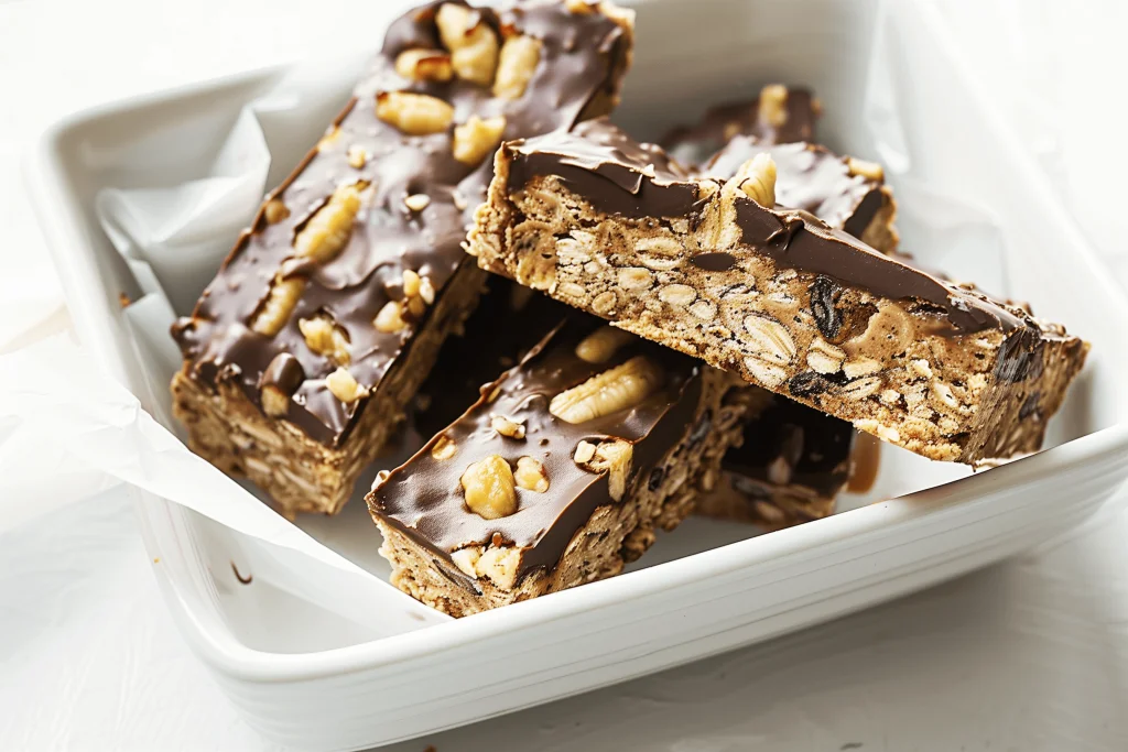1. Backofen auf 170 °C (340 °F) vorheizen. Ein Backblech mit Backpapier auslegen. 2. Mandeln und Kürbiskerne fein hacken. 3. Schälen Sie die Bananen und zerdrücken Sie sie mit einer Gabel, bis eine breiige Konsistenz entsteht. 4. Apfelmus untermischen und dann die restlichen Zutaten hinzufügen. 5. Die Masse etwa 1 cm dick zu einem Rechteck (ca. 14 x 22 cm) auf dem Backblech verteilen. 6. In der Mitte des Ofens etwa 15 Minuten backen. Herausnehmen und abkühlen lassen. 7. Für die Glasur Kakaobutter in einer Metallschüssel über heißem Wasser unter Rühren schmelzen. Kakaopulver untermischen und mit Dattelsirup süßen. 8. Die Bananenriegel mit der Schokoladenglasur beträufeln und abkühlen lassen. Dann in 12 Riegel schneiden. An einem kühlen Ort aufbewahren, wo sie etwa eine Woche lang frisch bleiben.