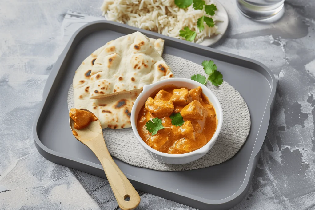 1. Heizen Sie den Backofen auf 220 °C (240 °C/475 °F/Gas 9) vor. 2. Mischen Sie alle Marinadenzutaten (500 g Hähnchenschenkel ohne Haut und Knochen, 150 g Vollfettjoghurt nach griechischer Art, Saft einer Zitrone, 1 TL gemahlener Kreuzkümmel, 1 TL Garam Masala, 1 TL Knoblauchgranulat, 2 TL geräuchertes Paprikapulver). Abdecken und bis zu 12 Stunden im Kühlschrank marinieren. 3. Mariniertes Hähnchen auf ein mit Backpapier ausgelegtes Backblech legen und 10–15 Minuten backen, bis es gar ist. 4. 20 g ungesalzene Butter und 1 TL mit Knoblauch angereichertes Olivenöl in einem Topf schmelzen. 1 fein gewürfelte Zwiebel hinzufügen und 3-4 Minuten kochen lassen. 5. Fügen Sie 3 EL Tomatenpüree, 3 geriebene Knoblauchzehen, 1 geriebenes daumengroßes Stück Ingwer und 2 TL Garam Masala hinzu. 2-3 Minuten kochen lassen. 6. 1 Würfel Hühnerbrühe mit niedrigem Salzgehalt in 200 ml kochendem Wasser auflösen und in die Pfanne geben. Umrühren und dann 100 g Vollfett-Joghurt nach griechischer Art oder Doppelrahm hinzufügen. 7. Die Soße aufkochen lassen, dann die Hitze reduzieren und 5 Minuten köcheln lassen. 8. Gebackenes Hühnchen und etwaige Kochsäfte zur Soße geben. Umrühren und mit Reis oder Fladenbrot servieren.