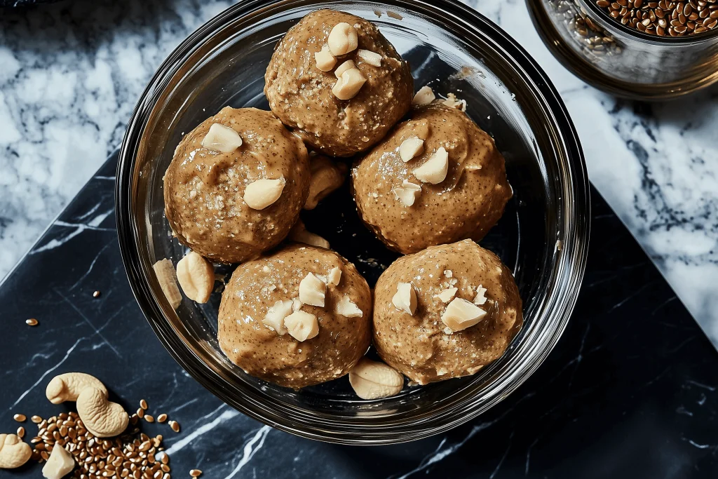 1. 1 EL ganze Leinsamen in 2 EL Wasser mindestens 1 Stunde einweichen, bis ein Gel entsteht. 2. Mischen Sie das Gel in einer großen Schüssel mit 1 gewürfelten Banane, 2 Tassen Cashewbutter, 2 EL geschälten Hanfsamen, 2 EL rohem Honig und 1/4 TL feinem Meersalz. 3. Einen gefrierfesten Behälter mit Backpapier auslegen. 4. Aus der Mischung Golfball-große Kugeln formen und in den Behälter geben. 5. Mindestens 4 Stunden einfrieren.