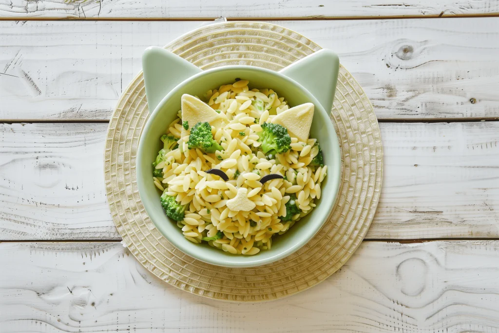 1. Einen Topf mit Wasser zum Kochen bringen und 200 g getrockneten Orzo hinzufügen. Nach Packungsanleitung kochen. 160 g gehackte Brokkoliröschen für die letzten 5 Minuten in das Nudelkochwasser geben. 2. Etwas Nudelwasser abschöpfen und beiseite stellen. Nudeln und Brokkoli abtropfen lassen und zurück in die Pfanne geben. 3. Fügen Sie 100 g/3,5 Unzen Vollfett-Frischkäse, 1 EL mit Knoblauch angereichertes Olivenöl, 90 g/3 Unzen geriebenen Cheddar, eine Prise schwarzen Pfeffer und einen Spritzer reserviertes Kochwasser hinzu. Gut umrühren und servieren.