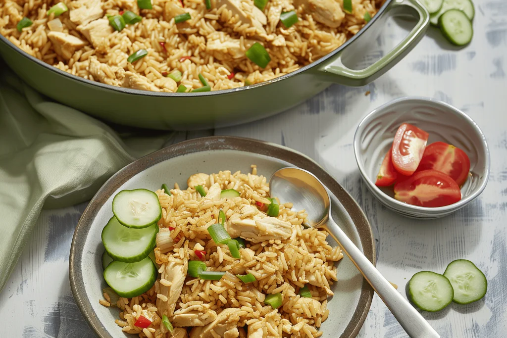 1. 1 EL mit Knoblauch angereichertes Olivenöl in einer großen beschichteten Bratpfanne bei mittlerer bis hoher Hitze erhitzen. 2. Fügen Sie die Hähnchenstreifen hinzu und kochen Sie sie 4 Minuten lang, indem Sie sie nach der Hälfte der Zeit wenden, bis sie gar sind. Herausnehmen und beiseite stellen. 3. In dieselbe Pfanne ½ EL mit Knoblauch angereichertes Olivenöl und geschnittene Schalotten geben und 2 Minuten kochen lassen. 4. Tomatenpüree, Knoblauch und Ingwer hinzufügen und eine weitere Minute kochen lassen. 5. Gekochten Basmatireis, Sojasauce und Limettensaft hinzufügen, umrühren und 4 Minuten kochen lassen, bis alles durchgeheizt ist. 6. Geben Sie das Hähnchen mit dem Bratensaft wieder in die Pfanne, rühren Sie die geschlagenen Eier unter und kochen Sie es 2 Minuten lang, bis die Eier fertig sind. 7. Mit geschnittenen Frühlingszwiebeln, Gurkenspalten und Tomatenspalten servieren.
