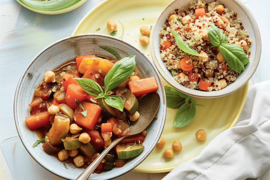 1. 3 zerdrückte Knoblauchzehen und 1 gewürfelte Zwiebel in 1 EL Olivenöl bei mittlerer Hitze mit 1 TL getrockneten italienischen Kräutern 5 Minuten lang kochen, dabei häufig umrühren. 2. Quinoa oder braunen Reis nach Packungsanleitung kochen. 3. 1 geschnittene Zucchini, 1 gewürfelte rote Paprika, 1 gewürfelte Aubergine und 400 g gehackte Tomaten in den Topf geben. Umrühren und abgedeckt 10–20 Minuten kochen, bis das Gemüse weich ist. 4. 400 g abgetropfte und abgespülte Kichererbsen hinzufügen und vermengen. 5. Mit Salz und Pfeffer abschmecken. Mit Quinoa oder Reis servieren.