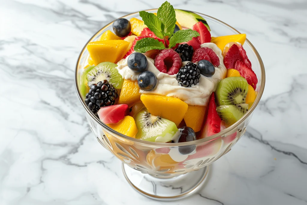 1. Den Kopf und den Schwanz der Ananas bedecken, die Haut entfernen und in Streifen schneiden. 2. Trauben, Kirschen und Erdbeeren vierteln. Kirschen entsteinen. 3. Satsumas schälen und segmentieren, Segmente halbieren. 4. Blaubeeren halbieren oder zerdrücken. 5. Bananen halbieren und in 3 Abschnitte teilen. 6. Mango schälen und in Streifen schneiden. 7. Kiwi schälen und in Spalten schneiden. 8. Alle gehackten Früchte in einer Schüssel vermengen. 9. Den Saft einer Orange hinzufügen, vorsichtig umrühren und 10 Minuten lang marinieren. 10. Mischen Sie 400 g griechischen Vollfettjoghurt mit der Schale und dem Saft einer Limette.