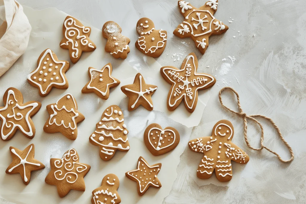1. 5 EL hellen Maissirup, 110 g unraffinierten weichen braunen Zucker und 150 g ungesalzene Butter in einem Topf 2-3 Minuten lang erhitzen, bis Blasen entstehen und geschmolzen sind. 5 Minuten abkühlen lassen. 2. Geben Sie in eine große Rührschüssel 350 g Mehl, 0,5 TL Natron, 4 TL gemahlenen Ingwer, 1 TL Gewürzmischung und 2 TL gemahlenen Zimt. Gut umrühren. 3. Machen Sie in der Mitte eine Mulde und gießen Sie die Sirupmischung hinein. Mit einem Holzlöffel rühren, bis ein Teig entsteht. 4. In Plastikfolie einwickeln und mindestens 30 Minuten im Kühlschrank lagern oder 15 Minuten einfrieren. 5. Heizen Sie den Ofen auf 180 °C (200 °C/400 °F) vor. 6. Den Teig auf eine Dicke von 5 mm (1/4 Zoll) ausrollen. Aus Ausstechformen 24 Kekse backen. 7. Legen Sie die Kekse auf ein antihaftbeschichtetes Backblech und lassen Sie dabei einen Abstand von mindestens 2 cm (3/4 Zoll) zwischen den Keksen. 8. 10-12 Minuten backen, bis die Ränder gerade anfangen, dunkelbraun zu werden. Auf einem Kuchengitter abkühlen lassen. 9. 150 g Puderzucker in eine Schüssel sieben und kaltes Wasser hinzufügen, um eine Glasur zu bilden. 10. Kekse mit Zuckerguss und optionalen Dekorationen verzieren. Lassen Sie die Glasur erstarren, bevor Sie sie verpacken oder aufhängen.