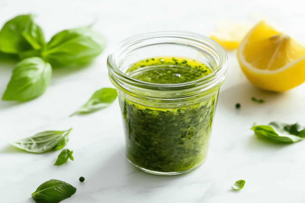 1. Geben Sie 60 ml natives Olivenöl extra, 1 EL Zitronensaft, 1 kleinen Streifen Zitronenschale, 0,5 Knoblauchzehen, 1 große Handvoll Basilikumblätter, 2 EL Estragonblätter, 2 EL Oreganoblätter und 2 Teelöffel Wasser in einen Mixer. 2. Mixen, bis eine glatte Masse entsteht. 3. In ein Glas umfüllen und bis zu 4 Tage im Kühlschrank aufbewahren. 4. Vor dem Servieren wieder auf Raumtemperatur bringen.