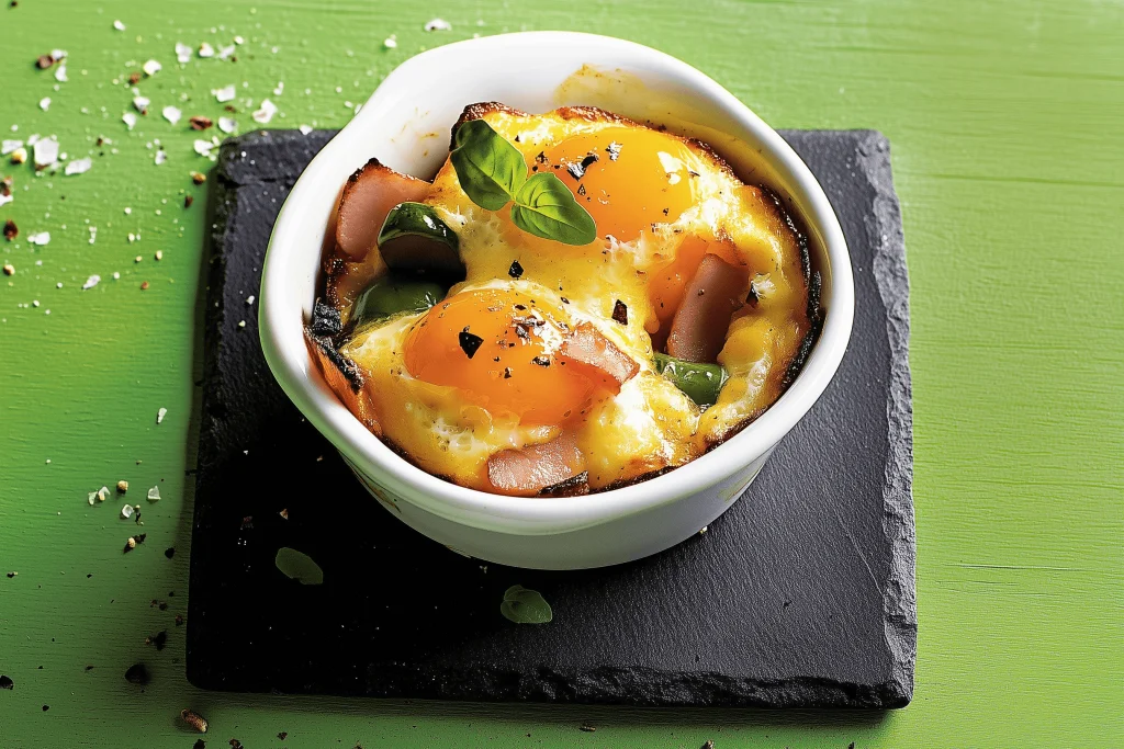 1. Den Backofen auf 180 °C (356 °F) vorheizen. 2. 2 EL Butter in einer Bratpfanne erhitzen und 1/4 gewürfelte Paprika, 1 gewaschene und in Scheiben geschnittene Zucchini, 60 g gewürfelte Aubergine und 1/2 gehackte oder geriebene Zwiebel sanft anbraten, bis sie weich sind. Vom Herd nehmen. 3. 4 gefettete 180-ml-Auflaufförmchen mit je 2 Scheiben Schinken auslegen. Die Gemüsemischung auf die einzelnen Auflaufförmchen verteilen. 4. In jede Auflaufform ein Ei aufschlagen und auf einem Backblech 20 Minuten backen. 5. Jedes Ei mit 25 g geriebenem Käse belegen und für weitere 5 Minuten in den Ofen geben. 6. Mit hausgemachtem Ketchup oder Tomatenwürfeln servieren.