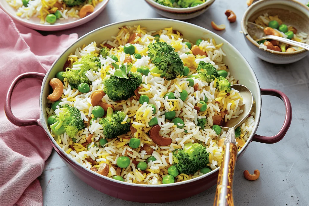 1. 2 TL Kokosöl in einer großen Pfanne erhitzen. 2. 1 gewürfelte Zwiebel und 3 zerdrückte Knoblauchzehen hinzufügen und glasig dünsten. 3. 2 TL Senfpulver, 2 TL Currypulver, 1 TL gemahlene Kurkuma und 1 TL Zwiebelpulver hinzufügen. 4. 75 g / 2,65 Unzen gefrorene grüne Erbsen und 1 in Röschen geschnittenen Brokkoli hinzufügen und bei mittlerer Hitze weich kochen. 5. 75 g / 2,65 oz Sultaninen und 75 g / 2,65 oz rohe Cashewnüsse hinzufügen und kurz vermischen. 6. 500 g gekochten Basmatireis in die Pfanne geben und gründlich umrühren. 7. Mit Salz und Pfeffer würzen und kochend heiß erhitzen. 8. Mit Koriander-/Korianderblättern servieren.