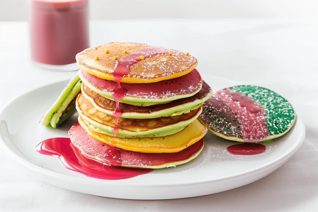 1. 2 mittelgroße Eier mit einem Handmixer 3-4 Minuten schaumig schlagen. 2. 1 Prise Salz und 200 ml ungesüßtes Hafergetränk hinzufügen. 3. 200 g/7,05 oz Dinkelmehl Typ 630 mit 2 TL Backpulver vermischen und unter die Eimasse heben. 4. Teilen Sie den Teig in drei Portionen. 5. Für rosa Pfannkuchen 60 g gekochte und vakuumverpackte Rote Bete würfeln und mit einem Drittel des Teigs pürieren. 6. Für grüne Pfannkuchen 40 g jungen Spinat waschen, trocknen und mit einem weiteren Drittel des Teigs pürieren. 7. Für gelbe Pfannkuchen 1/2 TL gemahlene Kurkuma und 1 Prise Zimt unter das letzte Drittel des Teigs mischen. 8. Eine Pfanne erhitzen und je nach Bedarf Butter oder Kokosöl hinzufügen. 9. 1 EL Teig pro Pfannkuchen in die Pfanne geben und bei niedriger bis mittlerer Hitze 3–4 Minuten pro Seite braten, bis er leicht gebräunt ist.