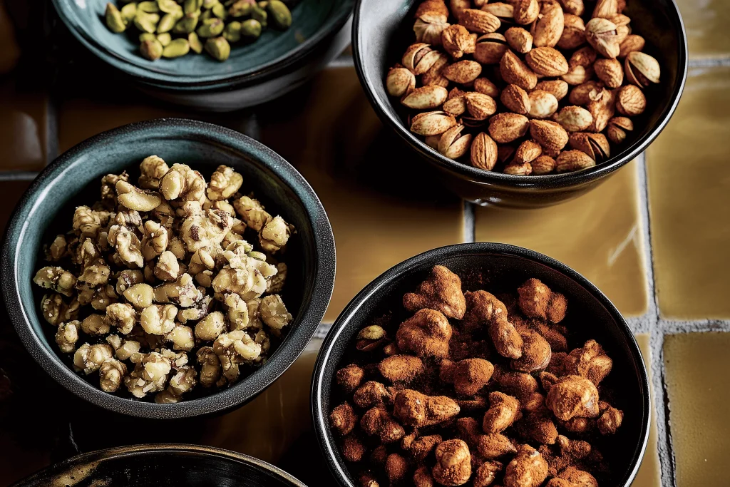 1. Den Backofen auf 175 °C (350 °F) vorheizen. 2. 1 Tasse verschiedene rohe Nüsse mit 1 TL Avocadoöl und 2 TL Apfelessig vermischen. 3. Auf ein Backblech legen und 5-10 Minuten rösten, bis es geröstet ist. 4. Kombinieren Sie 0,5 TL Knoblauchpulver, 0,25 TL gemahlene Kurkuma, 0,5 TL Paprika, 0,125 TL Cayennepfeffer, 0,25 TL gemahlener Chipotle, 1 TL Nährhefe, 0,25 TL koscheres Salz, 0,125 TL schwarzer Pfeffer und 0,5 TL Kokosnusszucker in einer Schüssel. 5. Die gerösteten Nüsse in der Gewürzmischung vermengen. 6. 1 TL Avocadoöl hinzufügen und mit mehr Salz und schwarzem Pfeffer abschmecken. 7. Warm servieren oder bis zu einer Woche in einem luftdichten Behälter aufbewahren.