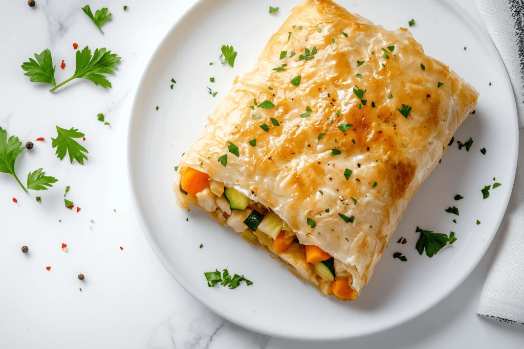 Dieses Rezept ist vollgepackt mit verstecktem Gemüse wie Karotten, Zucchini und Kürbis, die reich an Vitamin A und C sind. Diese Vitamine sind essentiell für die Unterstützung des Immunsystems und der Augengesundheit deines Kindes. Außerdem liefert das magere Hähnchen hochwertiges Protein, das beim Wachstum und der Muskelentwicklung hilft. Die Verwendung von Filoteig hält es leicht, und die Sesamsamen liefern einen Schub an gesunden Fetten und Ballaststoffen. Eine nahrhafte und unterhaltsame Möglichkeit, Kinder dazu zu bringen, ihr Gemüse zu genießen!