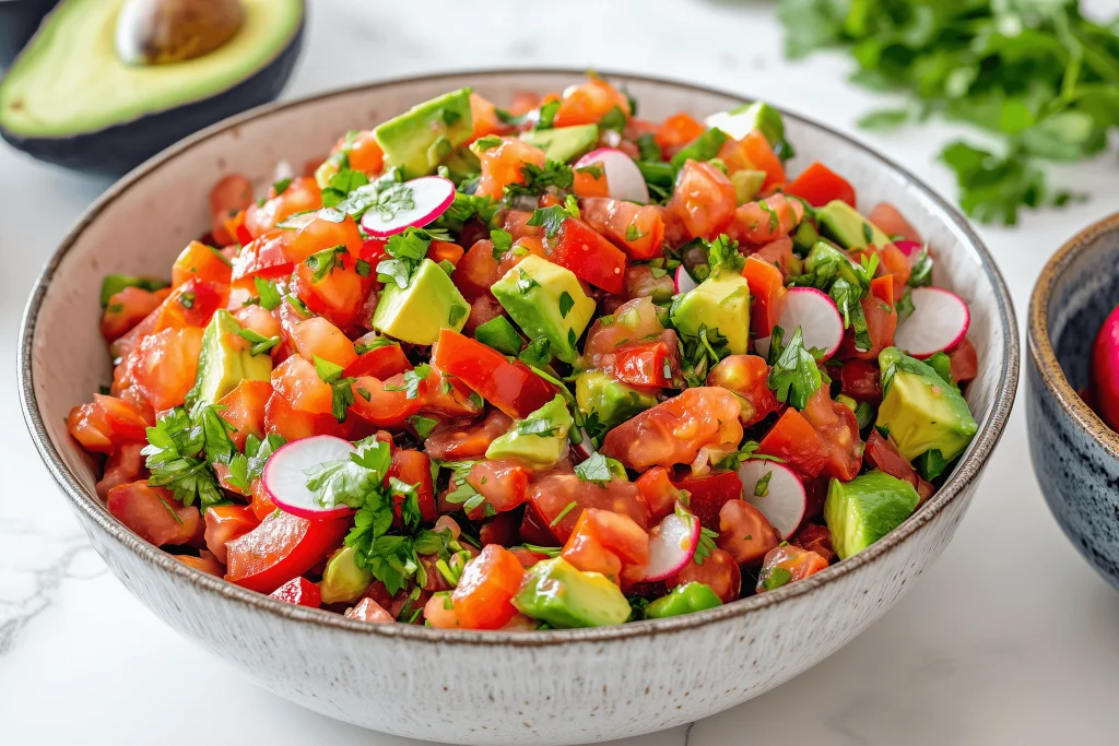 Du kannst die Avocado weglassen, wenn du den Salat als Salsa zu Nachos, Burritos oder Fajitas mit einem separaten Guacamole-Topping servierst. Füge dem Salat etwas Dosenmais oder schwarze Bohnen hinzu, um einen Dip im Salsa-Stil zu erhalten.