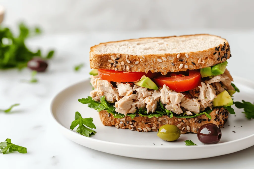 1. 185 g Thunfisch aus der Dose abtropfen lassen und pürieren. 2. Spülen und hacken Sie 1 TL gesalzene Babykapern. 3. Mischen Sie den Thunfisch und die Kapern mit 40 g Maiskörnern aus der Dose, 1 EL fein gehackter glatter Petersilie, 1 dünn geschnittenen Frühlingszwiebel, 50 g geriebener Karotte und 1 TL Vollei-Mayonnaise. 4. Mit frisch gemahlenem schwarzem Pfeffer würzen. 5. Die Mischung auf 2 Scheiben Vollkornbrot verteilen. 6. Fügen Sie 1 Scheibe gekochtes Ei und 45 g / 1,59 Unzen Baby-Rucola hinzu und belegen Sie das Ganze mit weiteren 2 Scheiben Vollkornbrot.