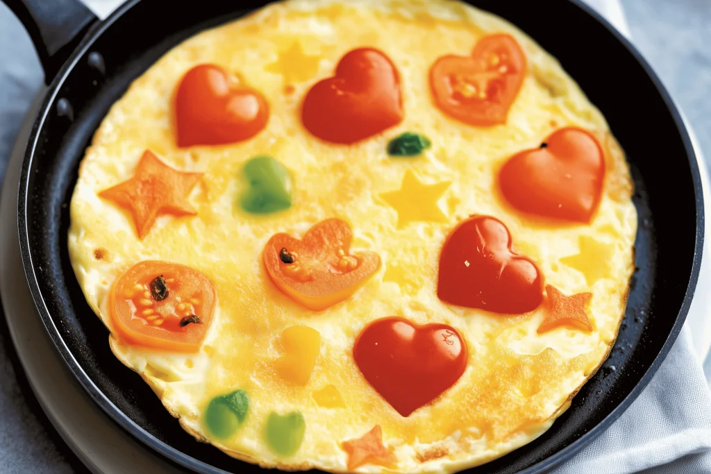 1. Kochen Sie ein paar in Stücke geschnittene Karotten-, Paprika- und Zucchinischeiben, bis sie weich sind. Abtropfen lassen und beiseite stellen. 2. In einer Schüssel 2 Eier und 2 EL Milch verquirlen. 3. 2 EL Butter in einer Pfanne schmelzen und die Eimischung hineingießen. 4. Bei schwacher Hitze kochen, bis das Ei gar ist. 5. Streuen Sie 25 g geriebenen Käse darüber. 6. Die gekochten Gemüseformen darüber verteilen und auf dem Herd erhitzen, bis der Käse geschmolzen ist. 7. Servieren Sie das Omelett offen, sodass die Formen sichtbar sind, oder falten Sie es um und legen Sie es auf einen Teller.