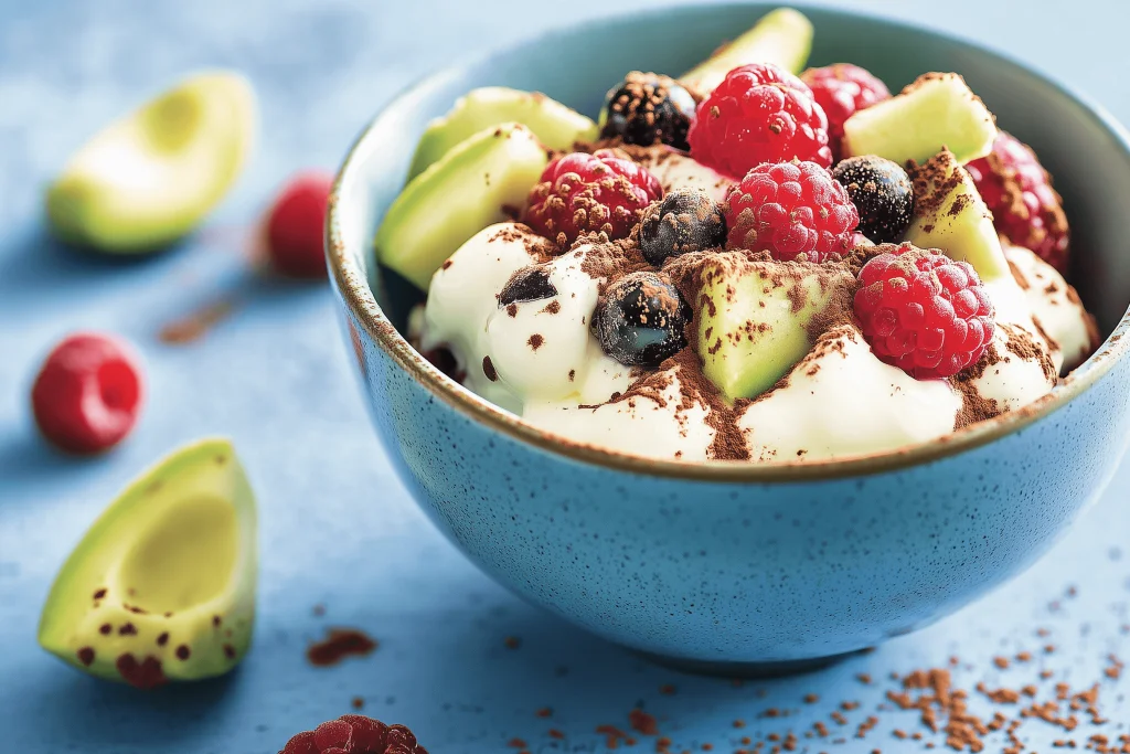 1/4 diced Avocado, 75g / 2.65oz Plain yogurt, handful fresh Fresh raspberries, 1 tsp Cocoa powder