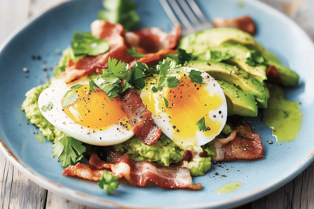 1. Spoon 1/2 Avocado into a bowl, mash until soft but not completely smooth. 2. Stir in 1/2 diced Tomato, 1 tbsp chopped Coriander, 1 thinly sliced Spring onion, and 1 squeeze Lemon juice. Season with salt and pepper. 3. Spread the avocado mix onto a plate, top with 3 rashers cooked until crispy Bacon and 2 boiled Eggs. 4. Sprinkle a little fresh Coriander and drizzle extra virgin Olive oil over the top.