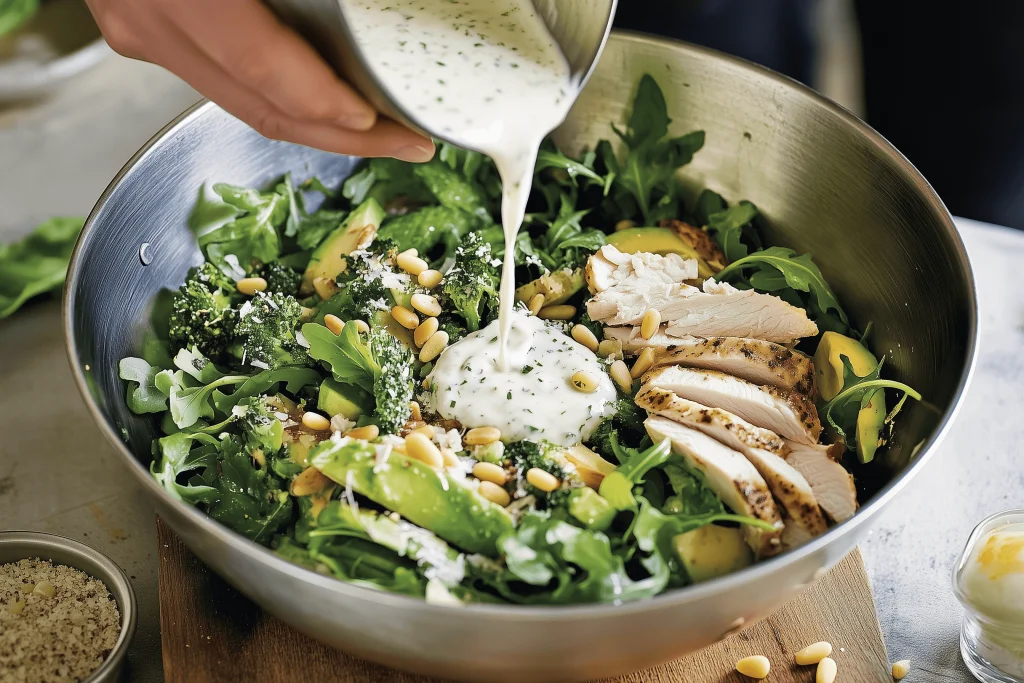 1. Put 50g rinsed Quinoa in a small saucepan with 185ml water and bring to boil. Reduce heat, cover, and cook for 10-12 minutes until water evaporates and quinoa is light and fluffy. Turn off heat and let stand covered for 5 minutes. 2. Make dressing by shaking 1 tbsp extra virgin olive oil, 2 tsp lemon juice, 1/4 tsp dijon mustard, 1/2 tsp Greek-style yoghurt, and 2 drops maple syrup in a screw-top jar. Season with salt and pepper. 3. Put quinoa in a large bowl and add 70g shredded cooked chicken, 4 blanched and chopped broccolini stalks, 45g rocket, 1/4 chopped avocado, 1 thinly sliced spring onion, 1 tbsp finely chopped mint leaves, 1 tsp pepitas, and 1 tsp toasted pine nuts. 4. Transfer salad to a serving plate or container. Just before serving, drizzle with dressing to taste, gently toss to combine, and sprinkle with 10g shaved parmesan cheese.