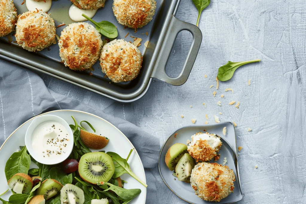 1. Preheat the oven to 200°C/425°F. 2. Mix 400g/14oz cold risotto with 70g/2.5oz flour and 30g/1.05oz grated Cheddar. 3. Beat 1 egg in one bowl and add 60g/2.1oz Panko breadcrumbs to another bowl. 4. Slightly wet hands, take golf ball-sized amount of mixture, flatten, place a pinch of 62.5g/2.2oz mozzarella in the center, fold over edges, roll back into a ball. 5. Coat balls in egg, then breadcrumbs. 6. Drizzle balls with 0.5 tbsp oil, bake for 15-20 minutes until golden.
