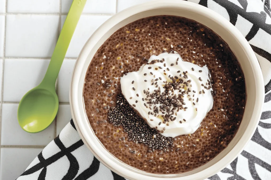 1. Stir together 3 tbsp Chia seeds and 250ml / 8.45fl oz Almond milk in a bowl. Cover and soak for at least an hour, preferably in the fridge overnight. 2. Add 2 tbsp Cocoa powder, 0.25 tsp Vanilla extract, and 1 peeled and sliced Banana to the bowl and blend until smooth. 3. Serve with a dollop of plain yoghurt and some sliced banana.