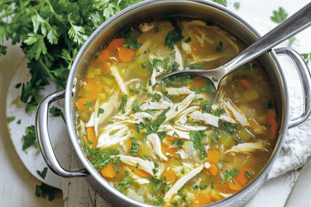 1. Put 200g / 7.05oz Skinless chicken breast fillet in a small saucepan and add enough water to cover the chicken. Bring to the boil over medium heat, then reduce the heat and simmer for 10 minutes. Remove from heat and leave the chicken to cool in the liquid while you prepare the vegetables. 2. Grate 2 peeled Carrots, 1 peeled Turnip, 2 Celery stalks, 1 Zucchini, 150g / 5.29oz peeled Butternut pumpkin, and 1 Brown onion. Transfer the grated vegetables to a large saucepan. 3. Shred the chicken and add it to the saucepan with the vegetables, then pour in 2000ml / 67.63fl oz Salt-reduced chicken stock. Bring to the boil, reduce the heat to a simmer, and cook for 25–30 minutes or until the vegetables are soft and sweet. 4. Add 1/3 cup chopped Flat-leaf parsley leaves and a good grinding of black pepper. Taste the soup and only add a little salt if necessary.