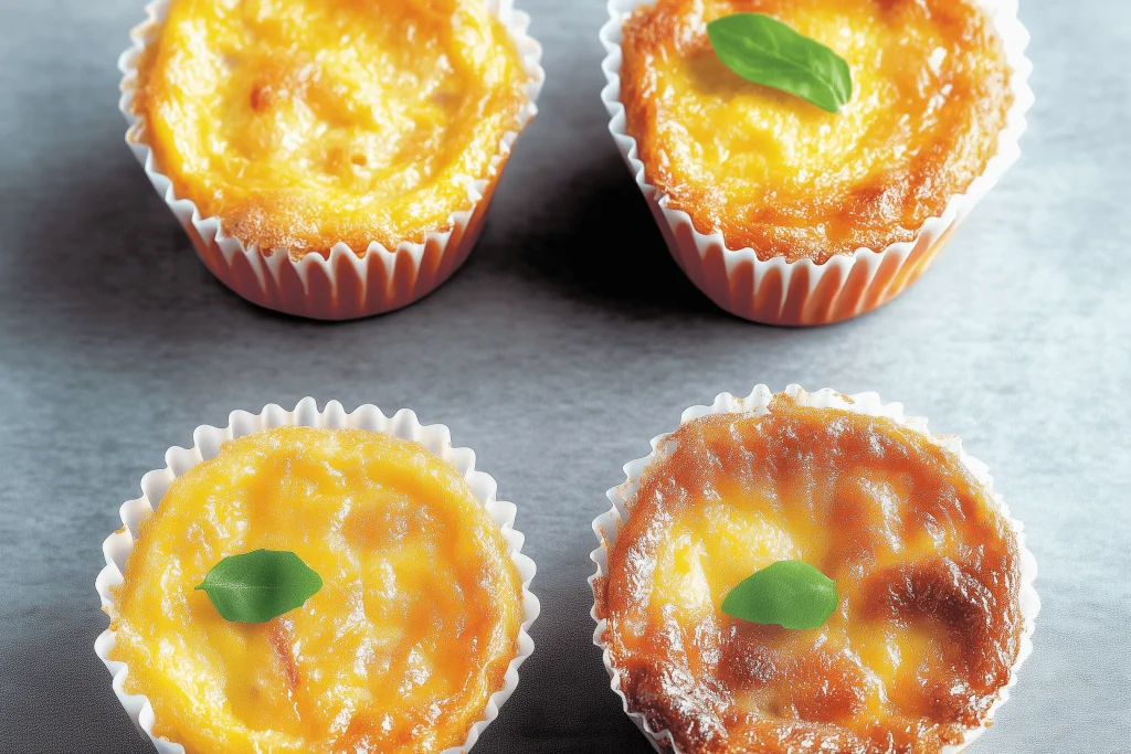 1. Preheat the oven to 180°C (356°F). 2. Melt 2 tbsp Butter in a frying pan and gently fry 1 roughly chopped Onion until soft. 3. Add 250g / 8.82oz roughly chopped Ham and remove from the stove. 4. Whisk together 4 Eggs, 2 Egg yolks, and 500ml / 16.91fl oz Cream with a little Salt and Pepper. 5. Grease a large 12-cup muffin pan. 6. Spoon the Onion and Ham mixture into the bases of the muffin pan and sprinkle over 100g / 3.53oz grated Cheddar. 7. Pour the Egg and Cream mixture into each muffin cup until it is about 1mm from the top. 8. Bake for about 25 minutes until the egg mixture is set and the top is golden. 9. Cool for 10 minutes and remove from the tin. Serve hot or cold.