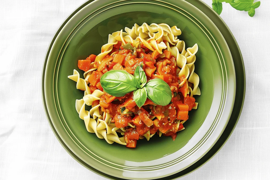 1. Cook 400g / 14.11oz gluten-free pasta from legumes in salted boiling water until al dente. Drain, rinse with cold water, and set aside. 2. Finely chop 1 garlic clove. Clean, peel, and dice 2 carrots and 1 kohlrabi. Clean and dice 1 celery stalk. 3. Heat 1 tbsp olive oil in a large pot, then briefly sauté garlic and vegetables. 4. Add 1 tbsp tomato paste and 400ml / 13.52fl oz tomato passata. Season with 1 tsp dried oregano, 1 pinch of salt, and 1 pinch of pepper. Let the sauce simmer uncovered over medium heat for 12-14 minutes. 5. Wash and dry 1 handful of basil leaves. 6. Serve pasta with vegetable bolognese, garnished with basil leaves.