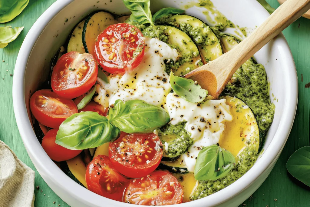 Pesto Zucchini with Panned Tomatoes and Grated Cheese