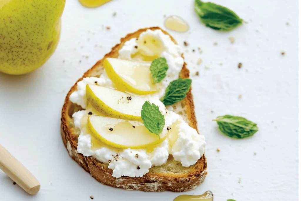 Ricotta Cheese, Pears, Mint Leaves and Honey on Toast