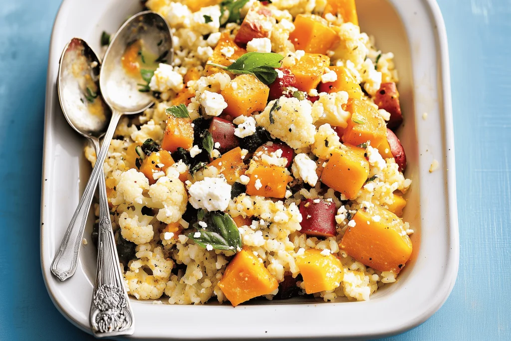 Roast Sweet Potato, Pumpkin and Feta Cauliflower-Rice Tumble Salad