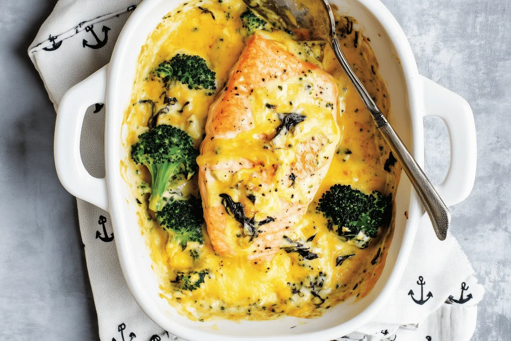1. Preheat the oven to 180°C (356°F). 2. Melt 1 tbsp Butter in a saucepan and gently fry 1 finely chopped Onion, 1 peeled and grated Carrot, and 3 skinned and chopped Tomatoes until soft. 3. Pour in 250ml / 8.45fl oz Cream and simmer for 5 minutes, stirring continually. 4. Remove from heat and stir in 50g / 1.76oz grated Cheddar cheese, 1 tsp finely chopped Fresh dill, and 200g / 7.05oz chopped Cooked broccoli. 5. Place 350g / 12.35oz Salmon fillet on a greased baking tray and spread 2 tsp softened Butter over the top. 6. Bake for 8 minutes. 7. Flake the fish into the sauce and mix well.