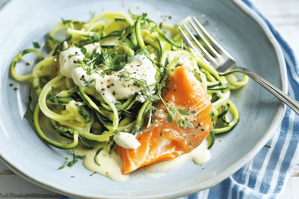 1. Fill a small saucepan with water and bring it to the boil. Add a pinch of salt and 180g / 6.35oz trimmed and halved Asparagus. Cook for 1-2 minutes, refresh in ice-cold water, and set aside. 2. Drop 400g / 14.11oz sliced Courgettes into the boiling water for 30 seconds, refresh in cold water and drain. 3. Pour 350ml / 11.83fl oz Cream into a saucepan with 1 tsp Dijon mustard and bring to the boil. Reduce the heat and simmer until it thickens slightly, about 5 minutes. 4. Stir in 125g / 4.41oz Cream cheese, 2 tbsp rinsed, drained and roughly chopped Capers, juice and zest of 1 Lemon, and 2 tbsp chopped Dill. Season with salt and pepper. 5. Stir in the Asparagus, Courgette noodles, and 100g / 3.53oz Smoked trout. 6. Garnish with a drizzle of olive oil and Parmesan shavings.