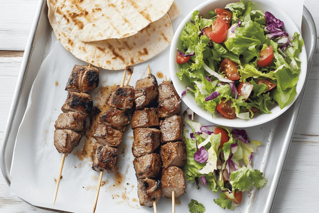 1. Soak eight bamboo skewers in water for 10 minutes. 2. Cut 400g / 14.1oz Lamb backstraps into 3 cm cubes and thread onto the skewers. 3. Combine 50ml / 1.69fl oz Red wine vinegar, 2 tbsp Extra virgin olive oil, 1 tbsp Tamari or light soy sauce, 1 tsp Dijon mustard, and 1/2 tsp ground Black pepper in a bowl and pour over the lamb skewers. 4. Marinate for at least 15 minutes. 5. Heat a barbecue hotplate or chargrill pan to medium. 6. Cook the skewers, turning regularly, for about 10 minutes or until done to your liking.