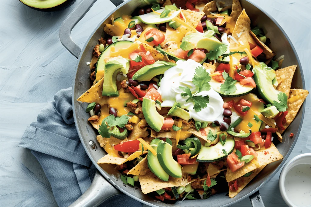 1. Preheat grill/broiler to high. 2. In a medium-sized pan, heat 1 tbsp Olive oil and add 2 tsp Paprika, 1 tsp Ground cumin, and 1 tsp Garlic powder. Stir for a few seconds. 3. Add 1 diced Onion and 2 crushed Garlic cloves; cook until translucent. 4. Add 2 diced Courgettes/Zucchini and 1 diced Red (bell) pepper/Capsicum; cover and cook for 5 minutes. 5. Drain and rinse 420g / 15oz canned Black beans; add to the pan and stir. 6. Spread 200g / 7oz Corn tortilla chips on a baking sheet and top with the cooked vegetables. 7. Sprinkle with more Paprika and top with grated Vegan hard cheese. 8. Grill/broil at 200°C (400°F) for 5 minutes or until cheese is melted. 9. Serve in bowls and top with optional garnishes like avocado, vegan sour cream, jalapeños, and cilantro.